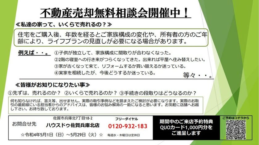 不動産売却相談会開催中!! 期間:令和4年5月1日(日)~5月29日(日) ※毎週水・木曜日は定休日 不動産売却をご検討の皆様、お気軽にご来店下さい。 ①売れるの? ②いくら...